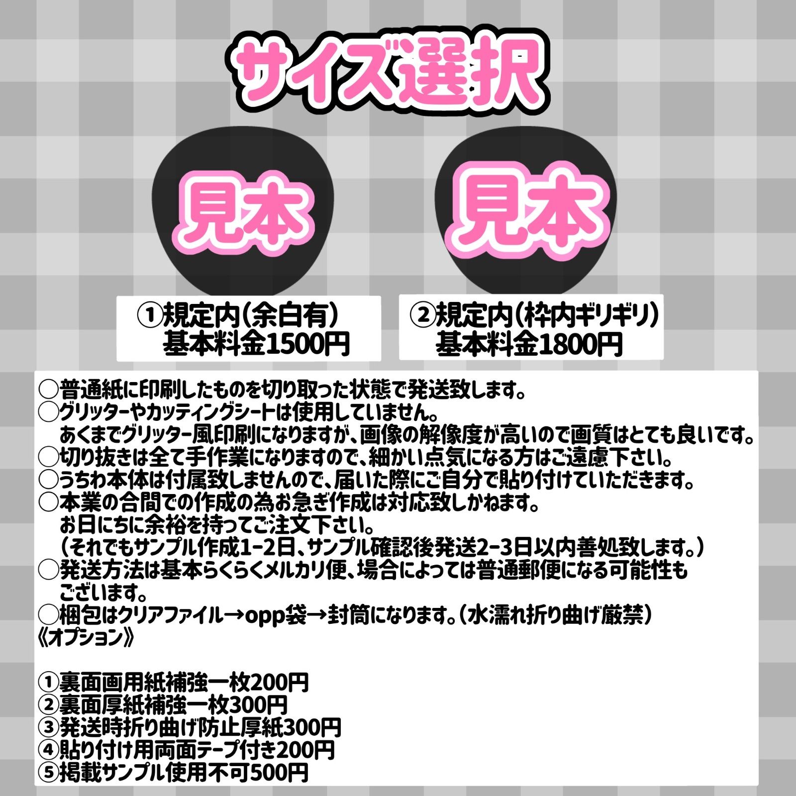 | 商品の特徴 | うちわ文字オーダー受付中!!一枚950円! CX-0819 コンサートうちわ。受付中】うちわ 文字 オーダー。うちわ文字 オーダー受付ページ - メルカリ うちわ文字 オーダー受付。※※※※※※※※※※※※※※※※※※※オーダー受付ページです。29 うちわ うちわ文字 コンサート ファンサうちわ オーダーうちわ 応援。最後まで説明文をお読みになってからコメント下さい(*^^*)こちらのページを購入しないで下さい!※※※※※※※※※※※※※※※※※※※手作りうちわ文字のオーダー受付け中!!ファンサ文字、名前どちらも作成可能です。King&Prince公式写真④。(画像はサンプルです)《料金表》送料込み一枚950円!(文字数など関係なく)→二枚1900円→三枚2750円→四枚3650円※文字のみの販売です。梶原真弓写真集。うちわ本体はつきません。濵田崇裕 歴代団扇。※両面に貼り付ける場合は2枚購入いただく形になります※ささやかながらリピーター様割引させていただいております《サイズ》ジャニーズ公式うちわにぴったりおさまるように作成致します。King&Prince公式写真②。(市販のジャンボうちわと記載されている商品と同じサイズです)《使用素材》蛍光シート→ピンク、黄色、オレンジ、黄緑画用紙→黒、白、水色、紫、肌色、赤裏面は両面テープになっていますので、お手持ちのうちわに貼り付けてすぐ使えます《お手元にお届けまでの流れ》①コメント欄にコメントをいただきましたら、専用ページを作成(ご使用予定日を記入お願いします)②文字や配色のご相談(手書きで配置などイメージをいただいても大丈夫です)③下書きを作成→画像を確認④確認後→金額訂正→購入手続き⑤お手続きいただき次第順次作成、完成次第専用の確認ページにてご確認いただき、発送※お手続き後のキャンセル、変更不可(装飾のみ追加や色変更のみ可)作成に入ってからの変更はもう一枚購入いただく形になりますので、ご了承下さい。推しメンマフラータオル 森田ひかる vol.5。《発送》メルカリ便※追跡の出来るメルカリ便発送のみ対応※万が一の配達事故には、メルカリから料金保証されます。滝沢歌舞伎ZERO 南座公演 パンフレット。(過去に配達時の事故があり、お荷物紛失、住所を間違えて配達されたという件がありました。【美品】上田竜也 公式うちわ グッズ セット。)※全てのお荷物にビニール掛けを致します※※※※※※※※※※※※※※※※※※※必ずプロフィールを最後までお読み下さい | ||